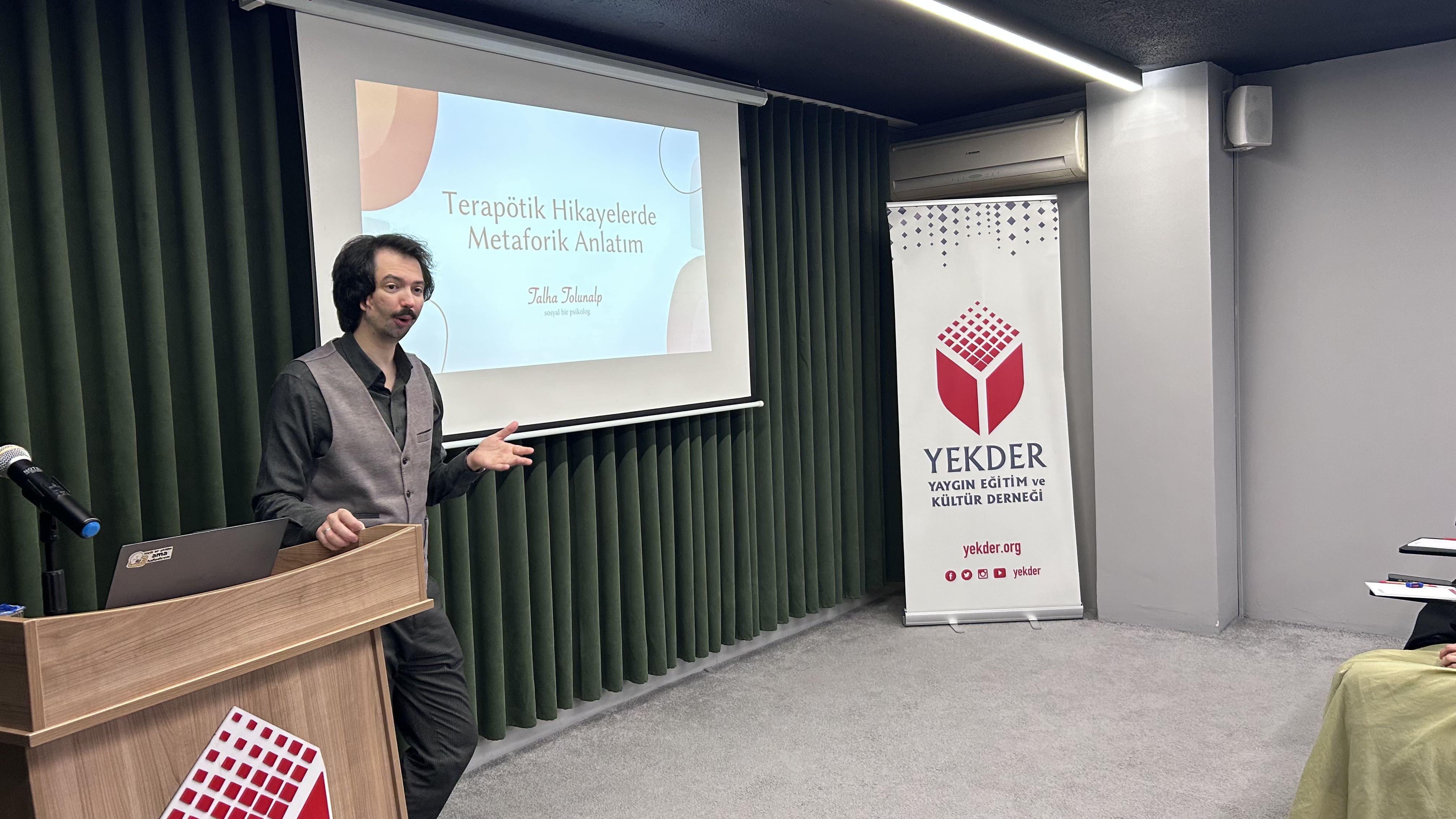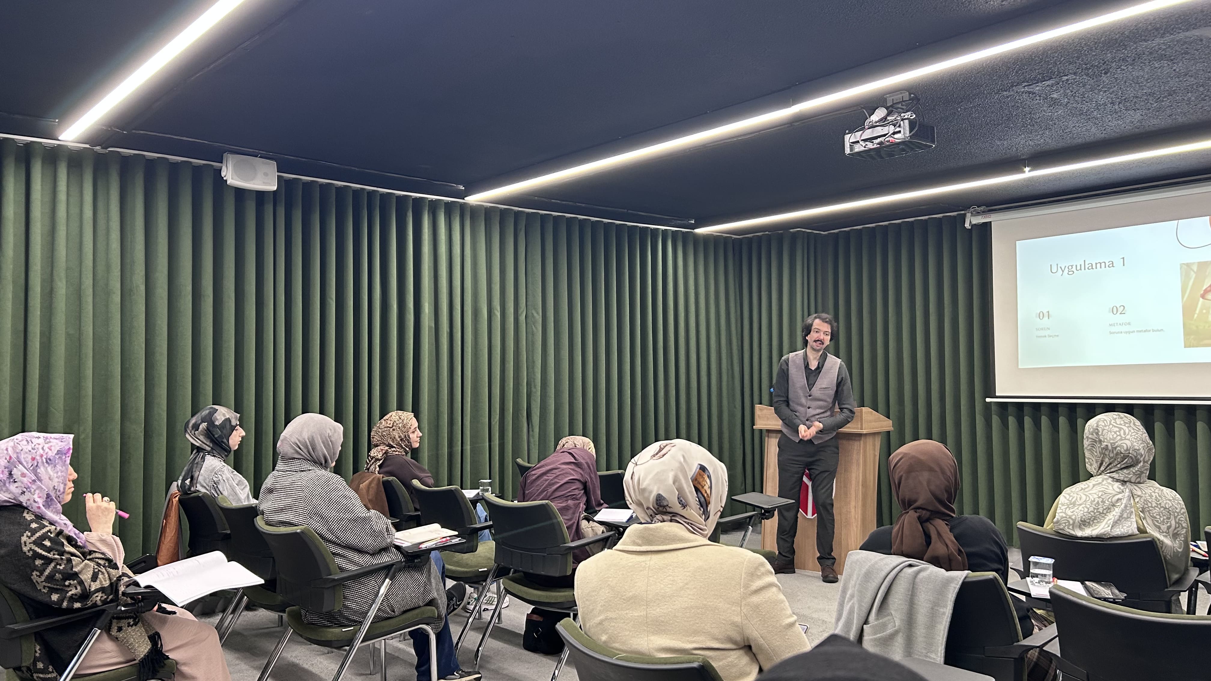 Eğitimin ilk dersinde Talha Tolunap ile “Terapötik Hikâyelerde Metaforik Anlatım” konusu ele alınarak hikâyelerde kullanılan metaforların bireylerin duygularını anlamlandırmadaki etkisi örnekler üzerinden açıklandı ve katılımcıların soyut kavramları hikâye içinde daha sade ve etkili bir şekilde ifade edebilmesine yönelik çalışmalar yapıldı.