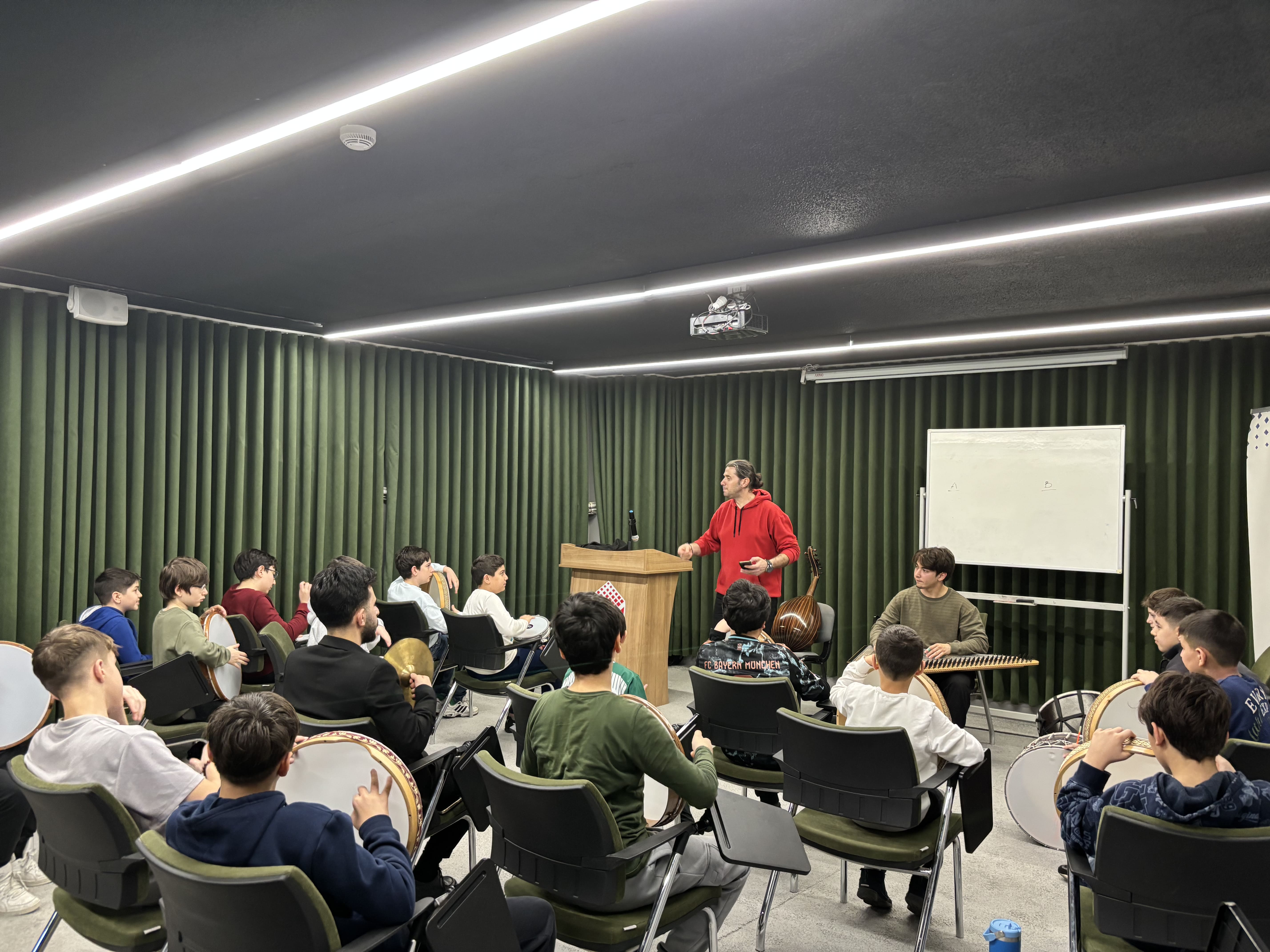 Bahar döneminin ilk etkinliklerinden biri, Hüseyin Süer moderatörlüğünde gerçekleştirilen Musiki Atölyesi oldu. Atölye kapsamında öğrenciler, Türk musikisinin temel usullerini tanıma ve uygulama fırsatı buldu. Özellikle bendir eşliğinde yapılan ritim çalışmaları, öğrencilerin hem dikkat hem de ritim duygularını geliştirmelerine katkı sağladı. Geleneksel musikimizin inceliklerini öğrenen öğrenciler, teorik bilgileri uygulamayla pekiştirirken keyifli ve öğretici bir deneyim yaşadılar. Musiki atölyesi, öğrencilerin estetik bakış açısını güçlendirmeyi ve kültürel mirasla bağ kurmalarını hedefleyen önemli bir çalışma olarak öne çıktı.