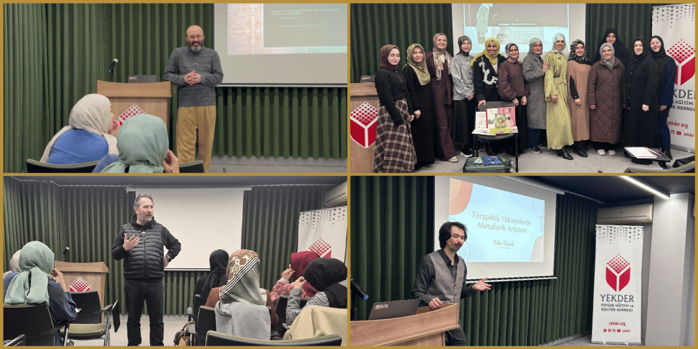 Eğitimin ilk dersinde Talha Tolunap ile “Terapötik Hikâyelerde Metaforik Anlatım” konusu ele alınarak hikâyelerde kullanılan metaforların bireylerin duygularını anlamlandırmadaki etkisi örnekler üzerinden açıklandı ve katılımcıların soyut kavramları hikâye içinde daha sade ve etkili bir şekilde ifade edebilmesine yönelik çalışmalar yapıldı.