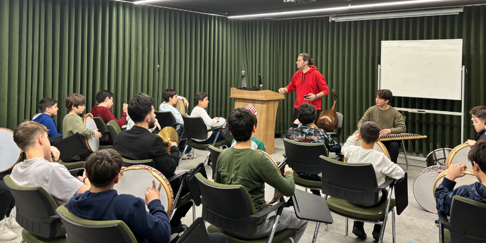 Bahar döneminin ilk etkinliklerinden biri, Hüseyin Süer moderatörlüğünde gerçekleştirilen Musiki Atölyesi oldu. Atölye kapsamında öğrenciler, Türk musikisinin temel usullerini tanıma ve uygulama fırsatı buldu. Özellikle bendir eşliğinde yapılan ritim çalışmaları, öğrencilerin hem dikkat hem de ritim duygularını geliştirmelerine katkı sağladı. Geleneksel musikimizin inceliklerini öğrenen öğrenciler, teorik bilgileri uygulamayla pekiştirirken keyifli ve öğretici bir deneyim yaşadılar. Musiki atölyesi, öğrencilerin estetik bakış açısını güçlendirmeyi ve kültürel mirasla bağ kurmalarını hedefleyen önemli bir çalışma olarak öne çıktı.