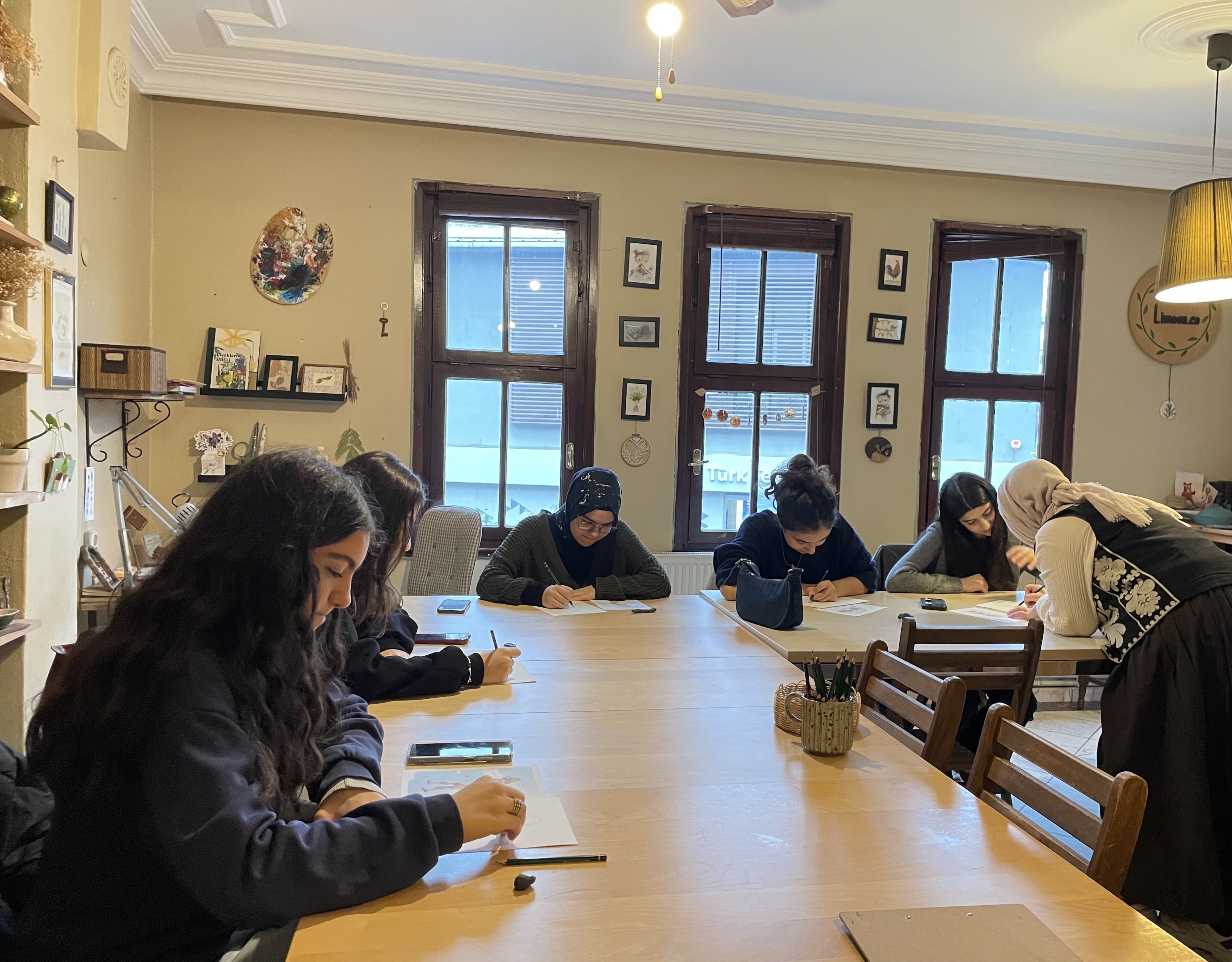 Lise kız öğrenci grubumuz ise bu hafta İslam’ın Özü ve Tevhid başlıklı derste inanç esaslarına dair derinlikli bir farkındalık kazandılar. Ders sonrası Atölye Balık’ta düzenlenen Karakalem Çalışmasına katılan öğrenciler, kendi “Karagöz ve Hacivat” figürlerini tasarlayarak hem geleneksel sanatlarımızla tanıştılar hem de yaratıcı yönlerini geliştirme fırsatı buldular.