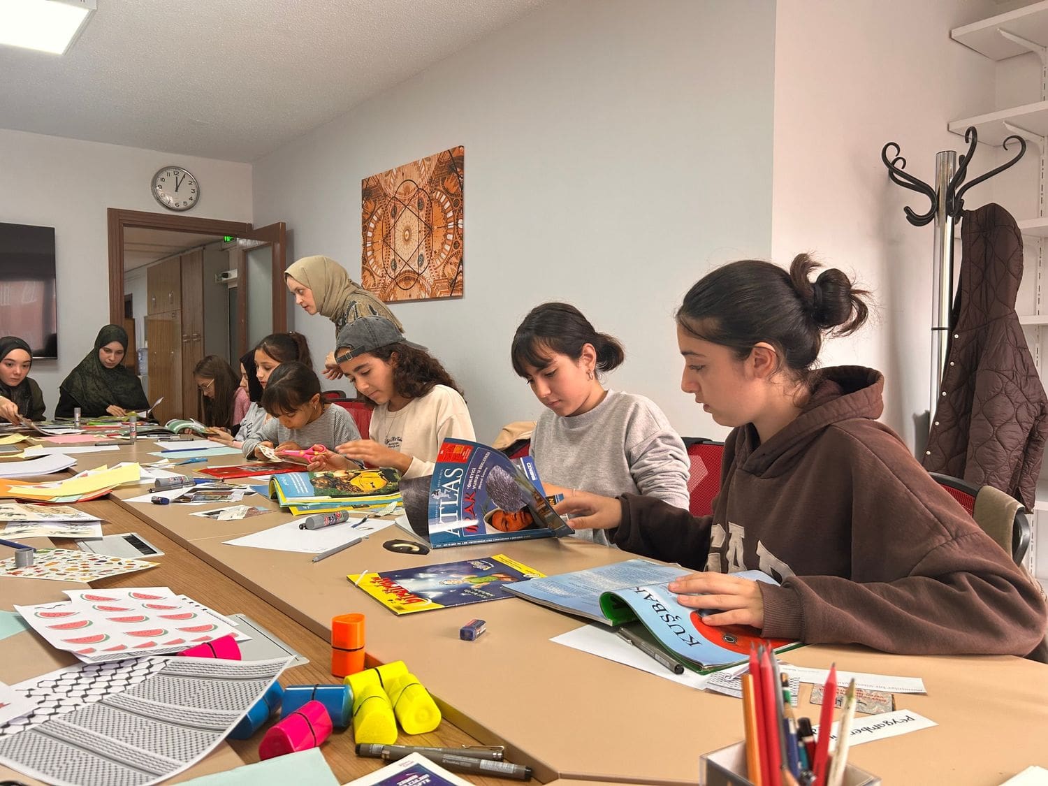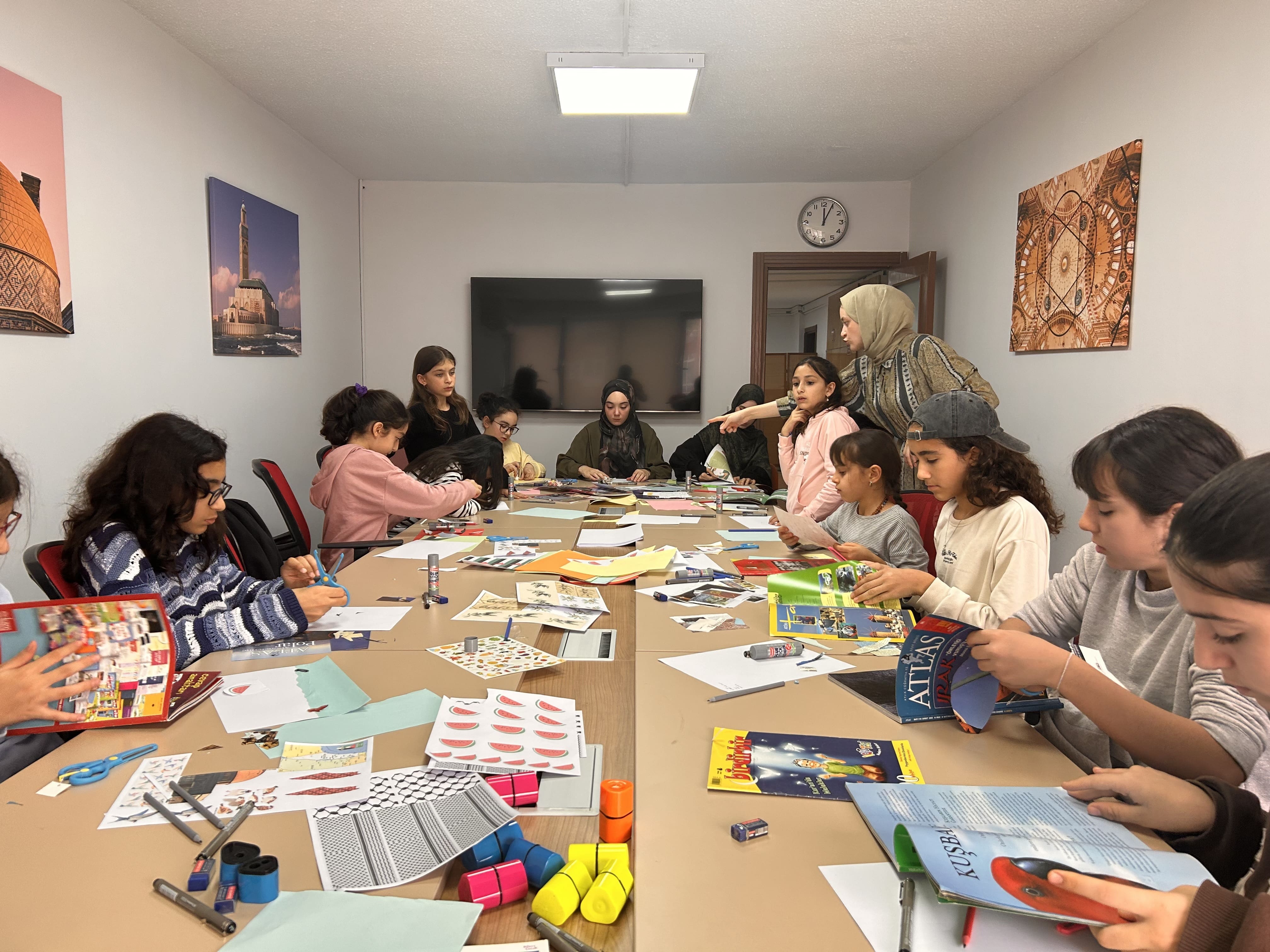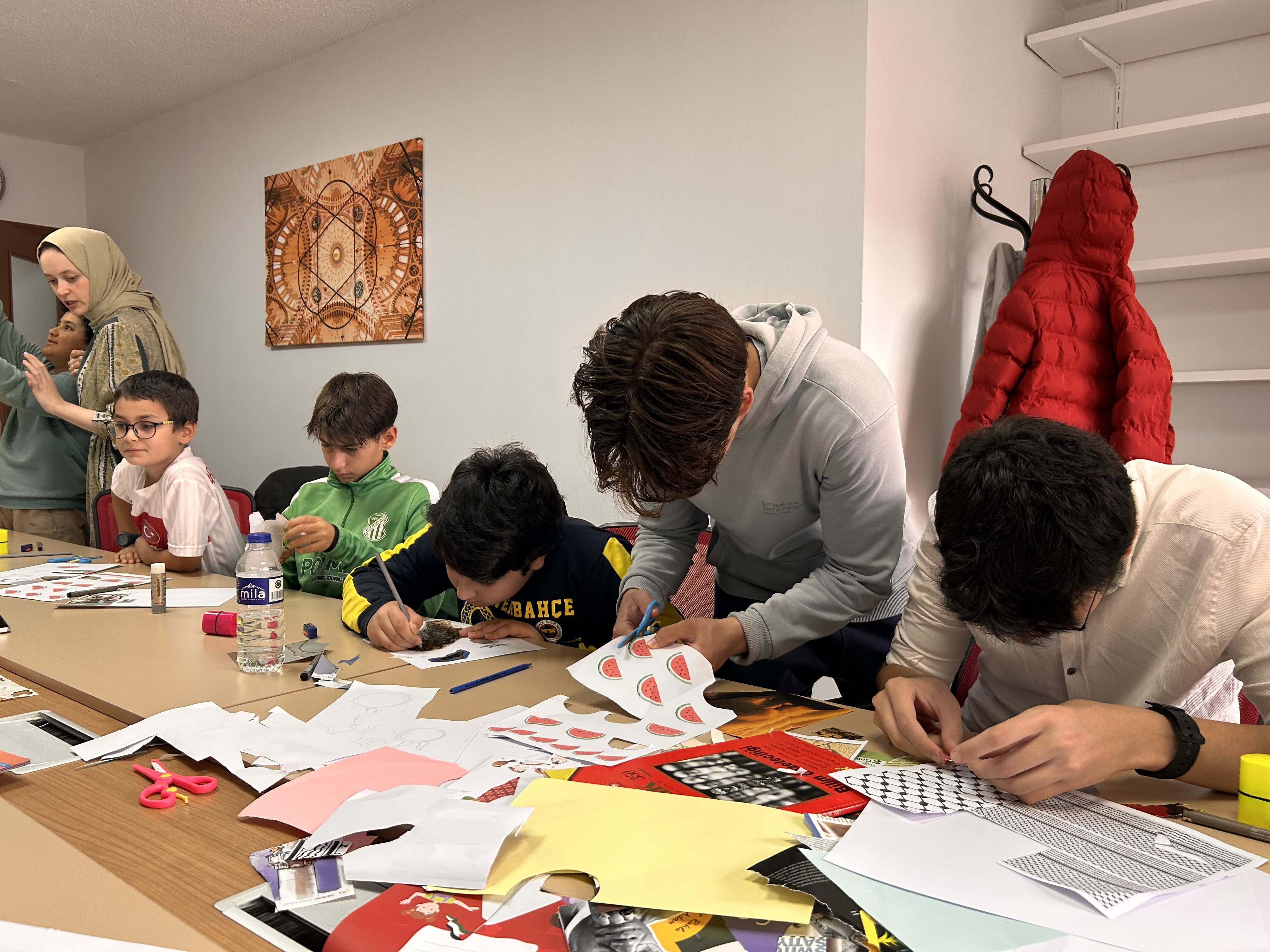 Ortaokul grubundaki öğrencilerimiz, bu hafta Rahman Suresi’ni okuyarak anlam ve tefekkür odaklı bir Kur’an dersi gerçekleştirdiler. Ardından “Temizlik” ve “Başarı Nedir?” başlıklı derslerde günlük yaşamla ilişkili temel değerleri ele aldılar. Haftanın en keyifli etkinliklerinden biri ise Psikolog Sevde Ergen eşliğinde yapılan Kolaj Atölyesi oldu. Öğrenciler, “Filistin” teması etrafında duygu ve düşüncelerini renk, şekil ve sembollerle ifade ederek anlamlı kolaj çalışmalarına imza attılar.
